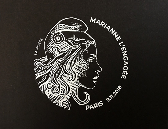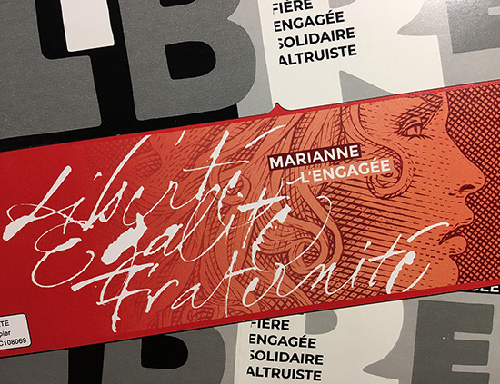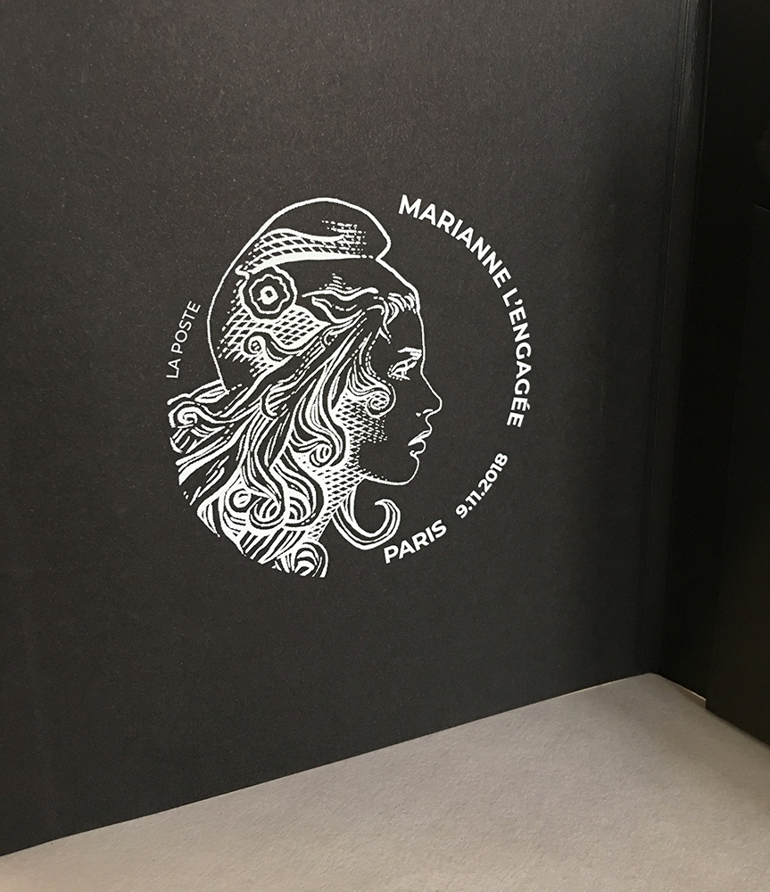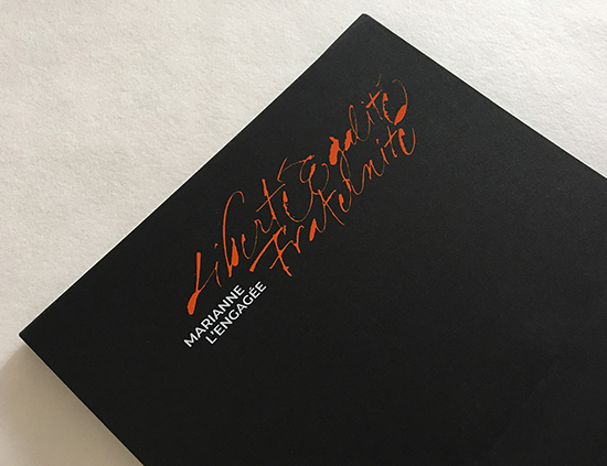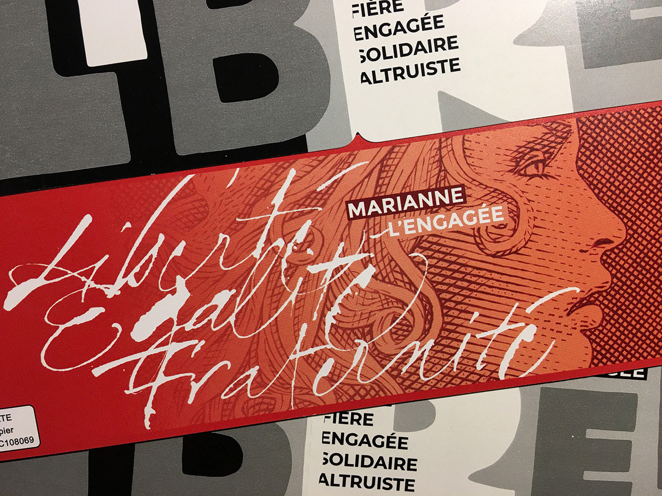 Réalisations autour de la sortie du timbre « Marianne l’engagée » (2018). Carnets adhésifs, carnets feuillets gommés, timbre à date, calligraphie Liberté Égalité Fraternité.